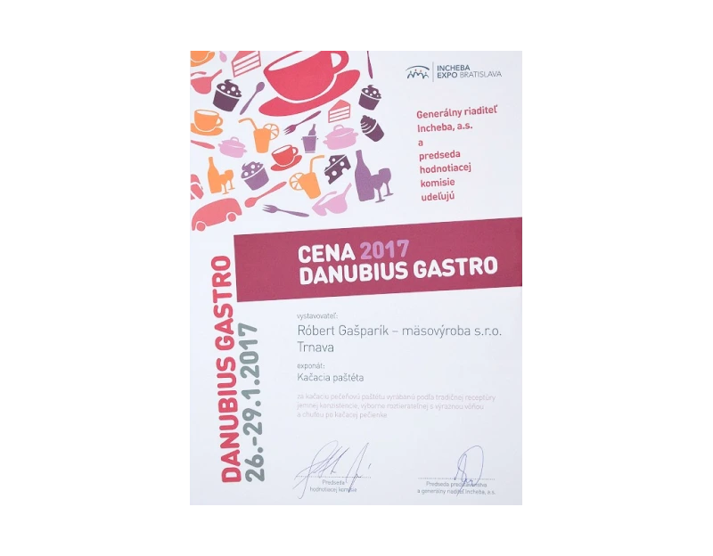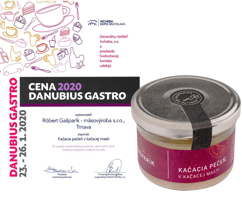 Spoločnosť Róbert Gašparík mäsovýroba získala za vystavovaný výrobok Kačacia paštéta cenu Danubius Gastro 2017 ako najlepší exponát veľtrhu. Ocenenie udelili za „paštétu vyrábanú podľa tradičnej receptúry jemnej konzistencie, výborne roztierateľnej s výraznou vôňou a chuťou po kačacej pečienke“.