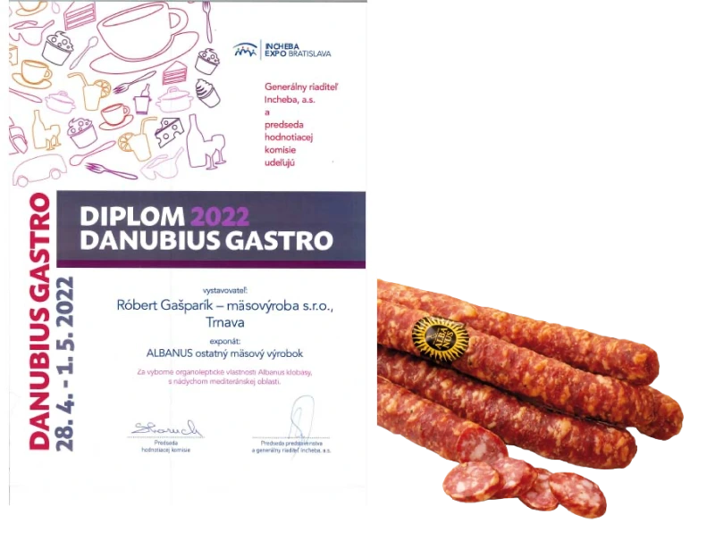 Cenu DANUBIUS GASTRO sme získali aj za klobásu Albanus. Hodnotiacu komisiu zaujal jej organoleptické vlastnosti (posudzovanie podľa ľudských zmyslov) s nádychom mediteránskej oblasti..